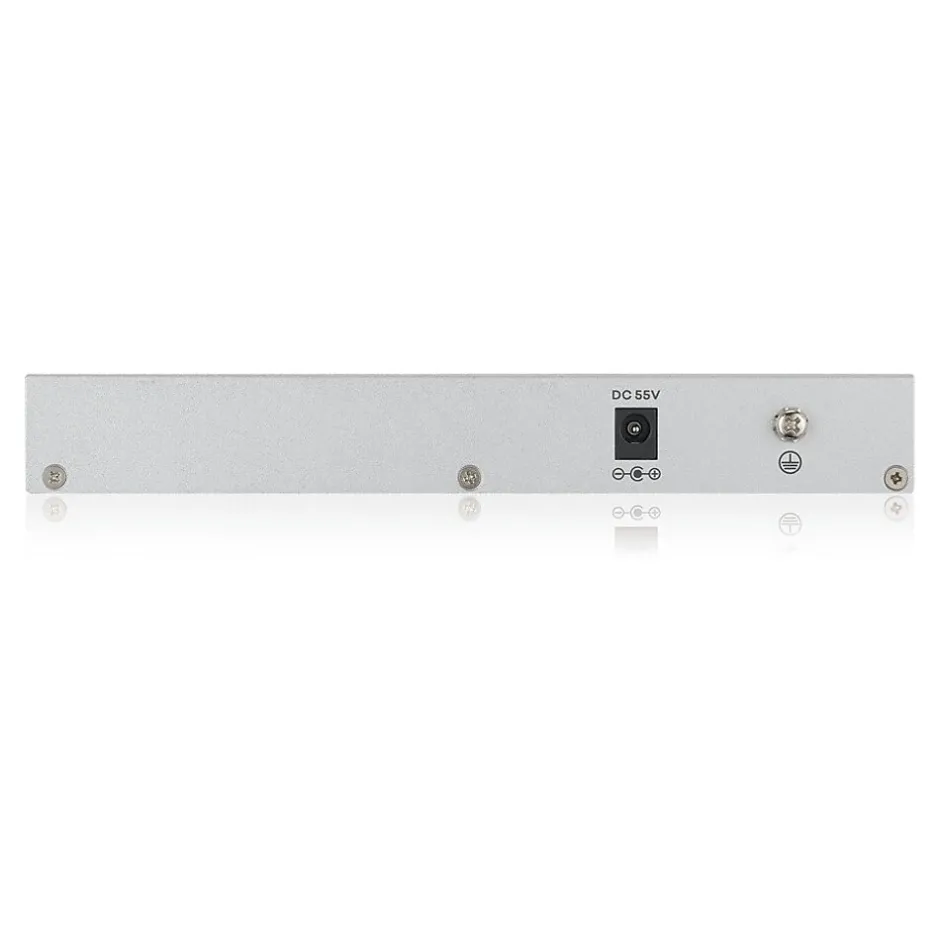 The Zyxel GS1200-5HP managed 5-Port Gigabit PoE+ Desktop Ethernet switch in gray color, features switching capacity of 10 Gbps, 2K MAC address and memory buffer of 128KB. It has an input voltage of 55 V, input current of 1.3 A and consumes maximum power of 72 W.